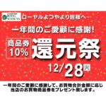 一年間のご愛顧に感謝して、12/28にお買い物金額に応じて商品券をプレゼントする「還元祭」を開催します! 対象は28日のお買物合計が税込4,000円以上のお客様となります。4,000円から千円ごとに10%還元し、商品券を […]